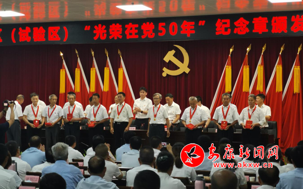 在慶“七一”表彰大會(huì)上,全體參會(huì)黨員面對(duì)鮮紅的黨旗,高舉右手,重溫入黨誓詞,鏗鏘嘹亮的宣誓聲響徹會(huì)場(chǎng),激蕩人心,昭示著全區(qū)黨員矢志不渝為黨和人民事業(yè)不懈奮斗的堅(jiān)定信念。會(huì)上,為高劍村黨支部等10個(gè)先進(jìn)基層黨組織、王開(kāi)昌等10名優(yōu)秀黨務(wù)工作者、王天蒼等20名優(yōu)秀共產(chǎn)黨員代表分別頒發(fā)了榮譽(yù)證書(shū),為“光榮在黨五十年”的10名老黨員代表頒發(fā)了紀(jì)念章。