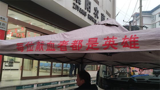 獻(xiàn)血車(chē)下的體檢棚子上寫(xiě)著這樣一句話:每位獻(xiàn)血者都是英雄。