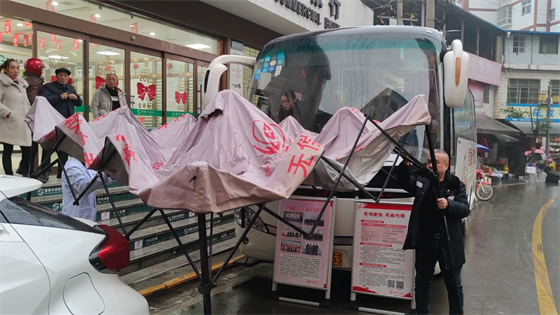 6點(diǎn)55,比預(yù)計(jì)出發(fā)時(shí)間早了5分鐘。在車(chē)上,我并非本地人,來(lái)此一年,卻從未看到過(guò)如此安靜的安康大道,和車(chē)內(nèi)磕磕碰碰發(fā)出聲響的展板、桌椅相比,真是兩個(gè)世界,接下來(lái)的路程將近2個(gè)小時(shí),所幸采血椅坐著很舒服,一位采血護(hù)士因?yàn)闀炣?chē),就不得不坐在靠前的冰冷板凳上。