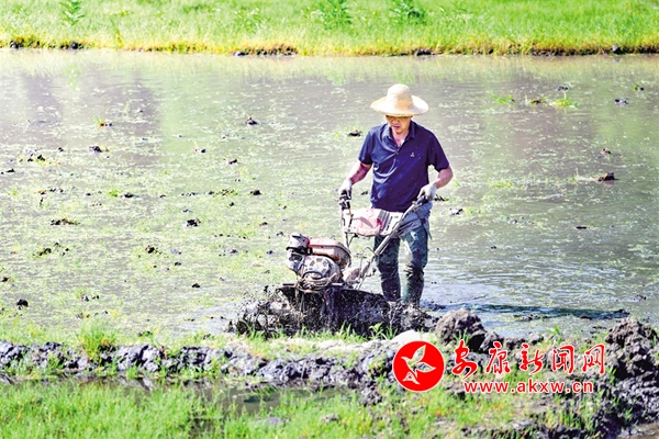 5月1日,石泉縣城關鎮(zhèn)絲銀壩村百畝水田里,農(nóng)戶操作旋耕機做好插秧前的各項準備工作。董長松 攝