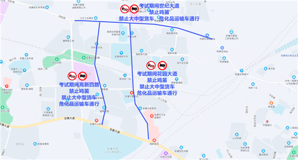 1、花園大道(安康大道至世紀(jì)大道)、世紀(jì)大道(新路口環(huán)島至五路口環(huán)島)、高新四路,所有通行車輛于6月6日21時至6月8日21時,無論遇到何種情況,一律禁止鳴笛,禁止大中型貨車、?;愤\(yùn)輸車通行。