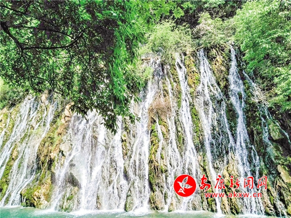 沿著木質(zhì)棧道前行,沒走多遠(yuǎn),耳中就傳來轟隆隆的水鳴聲,循聲望去,原來在大峽谷東南面的半山腰上有一掛巨大的瀑布。透過枝葉縫隙遙看瀑布的源頭,只見清清的泉水翻過一條石堰,從高高的崖壁口義無反顧地縱身飛躍而下,本是渾然一體的百米巨幅水簾,被凹凸不平的壁巖、樹枝、水草撕裂成形狀不一的一縷縷絹綢,千絲萬縷地交織著,撕扯著。細(xì)看,又猶如由萬千珍珠串起的珠簾,懸于半山腰間。瀑布四周彌漫著流云般的淡淡煙霞,初夏的陽光照耀著瀑布,折射出炫目的七彩光芒,形成一道道彩虹。粒粒珍珠流光溢彩、熠熠生輝。壁巖上嶙峋的怪石被水經(jīng)年累月地沖刷,早已失去了棱角,變得圓滑溫潤。因?yàn)槌睗竦木売?,巖壁上鋪了一層厚厚的、碧綠的青苔,讓瀑布有了層次感,像極了妙手丹青繪制的巨幅山水壁畫,鮮活靈動(dòng)。游人紛紛拿出手機(jī),在此排隊(duì)拍照、攝影留念。因它位于峽谷門口,似是迎接各位游客,故得名“迎賓瀑”。想到前幾日,朋友圈有人曬出聞名古今的廬山瀑布,只剩下一縷細(xì)細(xì)的溪流,從上面無力地流瀉下來,似是隨時(shí)都有中斷的可能,哪里還有“飛流直下三千尺,疑是銀河落九天”的氣勢時(shí),不由得對(duì)眼前的這掛瀑布更加喜愛。