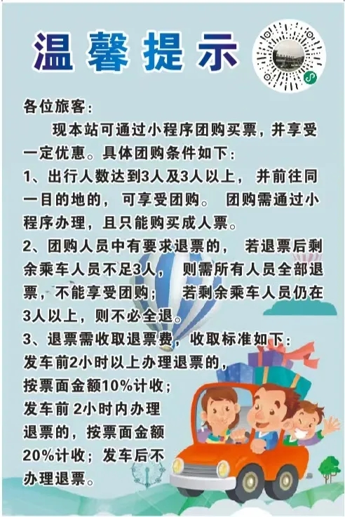 新增團(tuán)購(gòu)小程序,目前開(kāi)啟安康——紫陽(yáng)團(tuán)購(gòu)票,紫陽(yáng)全程68公里,途經(jīng)包茂高速,運(yùn)行大約1小時(shí)。票價(jià)最低20元起,三人可成團(tuán),購(gòu)票更優(yōu)惠!下方圖片內(nèi)二維碼可快速購(gòu)買。