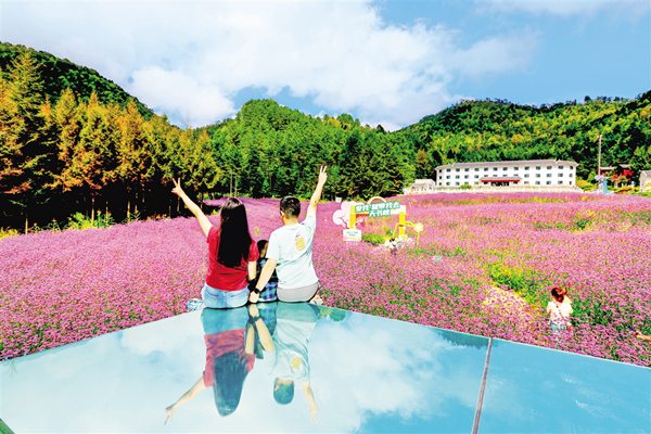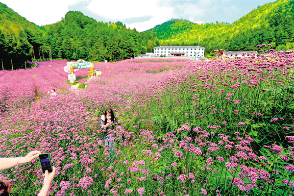 中秋節(jié)期間,平利千家坪森林公園天書峽馬鞭草花競相怒放。如畫的景色吸引眾多游客前來賞景打卡。(詹永桂 攝)