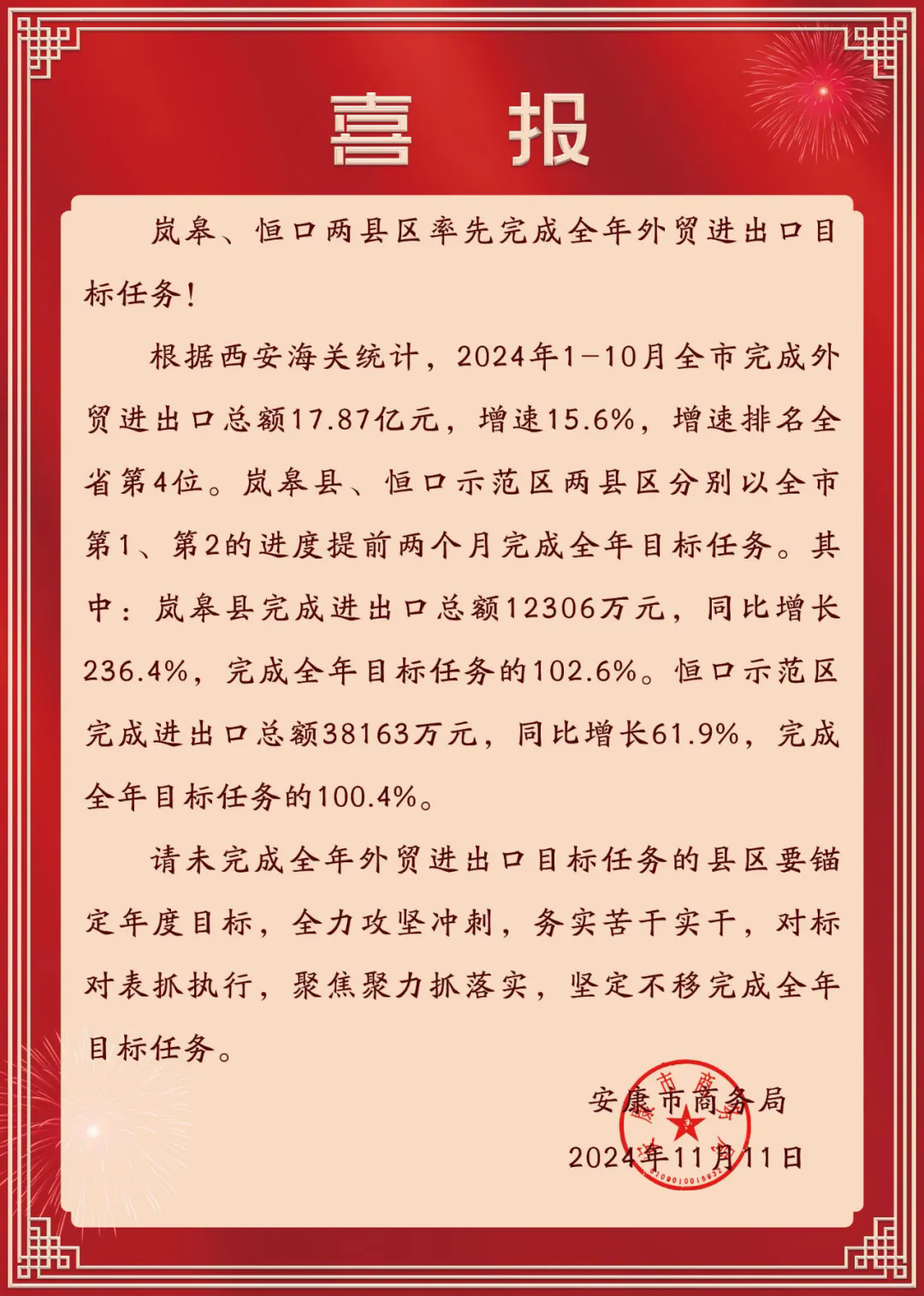 ?近日,市商務(wù)局發(fā)來喜報,恒口示范區(qū)率先完成全年外貿(mào)進出口目標(biāo)任務(wù)。
