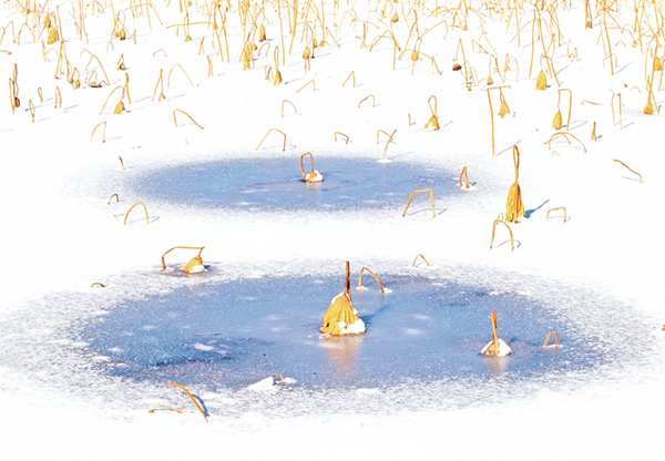 我的攝影創(chuàng)作圍繞生命的痕跡、時(shí)間的隱喻兩個(gè)主題。在《嘉實(shí)擷芳·野圃瑤音》中,菜園的微觀生態(tài)被賦予交響樂般的節(jié)奏——葫蘆藤的螺旋曲線是生命的律動(dòng),西紅柿根莖的垂直排列是生長的秩序,蚜蟲蝕痕的細(xì)節(jié)則暗喻生態(tài)的共生與抗?fàn)帯6凇冻武翳啊ど吃滤莨狻防?,榮成海岸的冬夏對(duì)比成為時(shí)間的隱喻,結(jié)冰湖面上的凋敗蓮蓬是流逝凝固的時(shí)光,夏日海邊的金色水洼則是流動(dòng)的永恒。我癡迷于捕捉這種矛盾與共生——就像用冷暖色調(diào)碰撞出畫面的張力,也用虛實(shí)構(gòu)圖處理每一張照片,期待每一張照片是個(gè)性鮮明,讓人耳目一新。