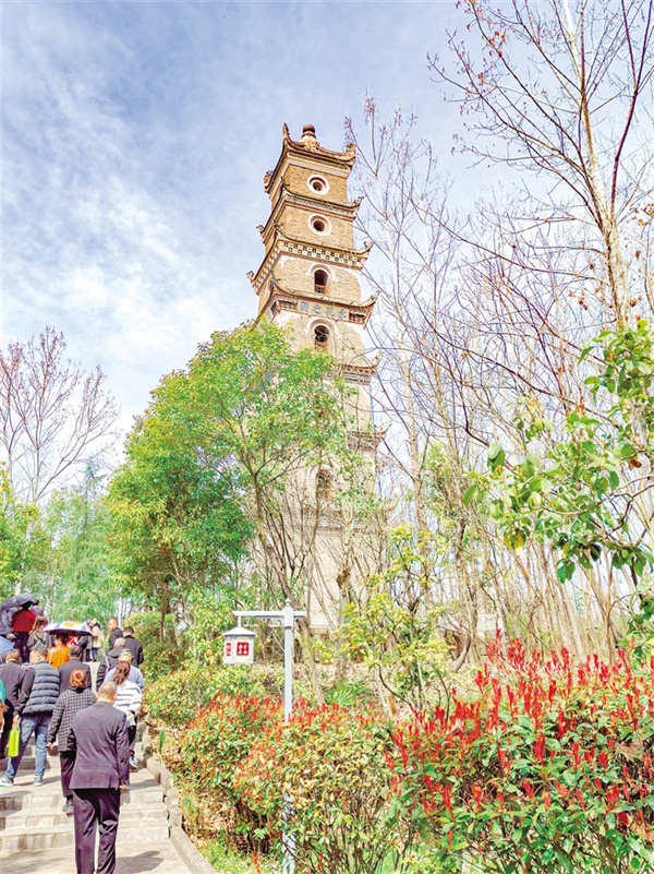 這時(shí),塔側(cè)傳來(lái)歡快的鑼鼓聲,循聲望去,是一段十幾米的孝義文化長(zhǎng)廊,一組男女或站或坐敲打著響器,使奠安塔不再寂寞。廊道的另一頭連接著奠安公園,環(huán)形觀景步道上擠滿了游覽的人。春分時(shí)節(jié),杏花正在萌發(fā),桃花含苞待放,倒是紅葉李花開(kāi)正艷,細(xì)小如甲的花瓣布滿枝頭,零落軟泥上,雪白一片,仿佛成了李花的世界。舉目四望,花草清新,小學(xué)生在撿拾垃圾,胸前的紅領(lǐng)巾在陽(yáng)光的照射下熠熠生輝,與周遭綠植映襯,絢爛了滿園春色。