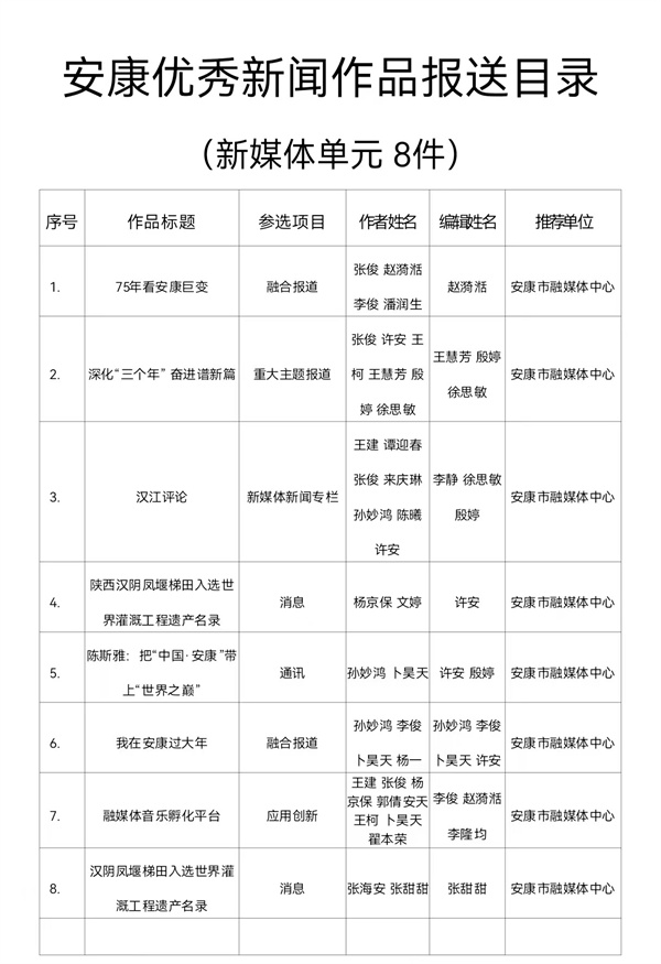 根據(jù)《關(guān)于開展2024年度安康優(yōu)秀新聞作品、安康市優(yōu)秀新聞工作者推選工作的通知》(安記協(xié)〔2025〕04號(hào))文件要求,經(jīng)推薦、領(lǐng)導(dǎo)審核,安康市融媒體中心推薦參評(píng)2024年度安康優(yōu)秀新聞作品97件(報(bào)紙單元58件,廣播電視單元31件,新媒體單元8件)。現(xiàn)將報(bào)送作品目錄(詳見附件)予以公示。