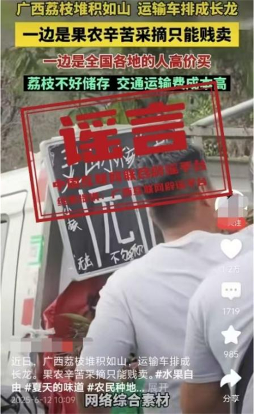 真相:6月12日,網(wǎng)傳“近日廣西荔枝堆積如山,運輸車排成長龍。果農(nóng)辛苦采摘只能賤賣”的視頻,畫面顯示荔枝堆積和“靈山荔枝1元”字樣。經(jīng)核查,視頻內(nèi)容并非發(fā)生在靈山縣。目前,靈山荔枝“妃子笑”等中熟品種逐漸批量上市,大規(guī)模上市時間為6月20日左右,當(dāng)前荔枝產(chǎn)銷有序開展,并未發(fā)現(xiàn)個別媒體報道的“荔枝滯銷賤賣”“采摘堆積成山”“運輸車排成長龍”的情況,也沒有發(fā)現(xiàn)價格低到1元的荔枝出售。(來源:“廣西互聯(lián)網(wǎng)違法和不良信息舉報”微信公眾號)