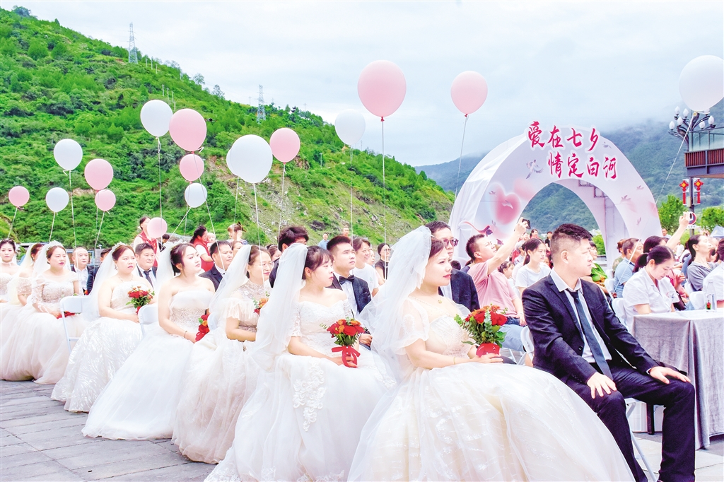 ?8月29日上午,“愛在七夕·情定白河”2025年白河縣新時代文明實踐集體婚禮主題活動在河街寶石文化廣場浪漫啟幕。來自各行各業(yè)的8對“珍珠婚”夫婦、8對新人齊聚一堂,通過分享婚姻保鮮秘訣、頒發(fā)結(jié)婚證、簽訂承諾書、開展婚姻家庭輔導等簡約而莊重的儀式,在各界代表和親朋好友的見證祝福下,開啟幸?;橐鲂缕?,用實際行動踐行婚事新辦、喜事儉辦的文明新風尚。(紀道婭 攝)