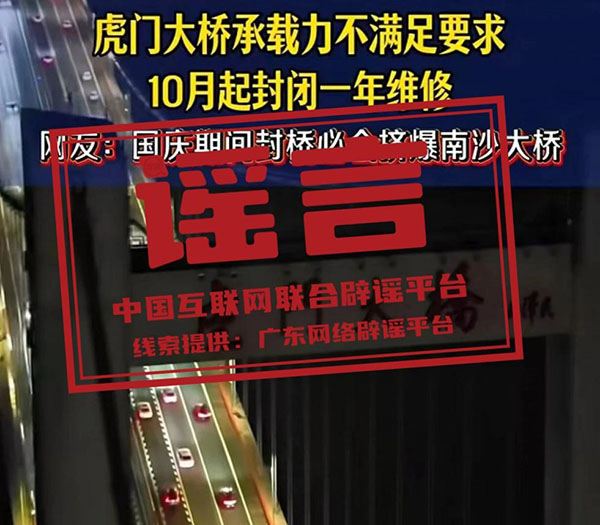 真相:近日,網(wǎng)絡(luò)上流傳“虎門大橋10月起封閉維修”的消息。經(jīng)東莞日?qǐng)?bào)記者核實(shí),該信息不準(zhǔn)確?;㈤T大橋在國慶假期期間將正常通行且繼續(xù)實(shí)行免費(fèi)政策。9月29日,廣東虎門大橋有限公司明確表示:虎門大橋在2026年春節(jié)前不會(huì)采取全封或半封措施,具體封閉時(shí)間及方案,目前均未確定。據(jù)悉,此前東莞市發(fā)展和改革局曾發(fā)布過相關(guān)評(píng)估前的公示,其中提到預(yù)計(jì)開工時(shí)間,但并非實(shí)際施工時(shí)間。(來源:“廣東省互聯(lián)網(wǎng)舉報(bào)中心”微信公眾號(hào)、東莞日?qǐng)?bào))