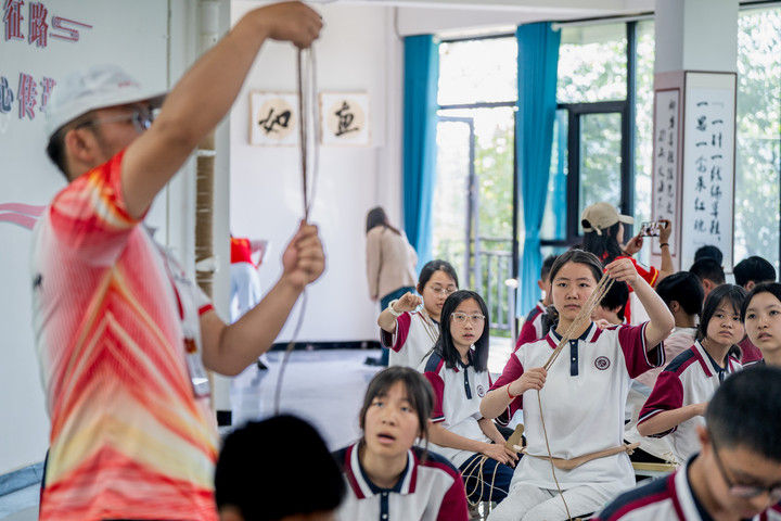 ? 2025年5月12日,云南省昭通市威信縣第一中學學生在大屏上紅色研學實踐基地體驗編織草鞋。200余名學生在紅色研學實踐基地親手編織草鞋、制作蠟染,并參觀了扎西會議舊址、紅軍長征過云南情景體驗館,在實踐互動中重溫紅色革命歷史。威信縣立足紅色文化資源優(yōu)勢,先后建成扎西會議紀念館、紅軍長征標語館等紅色文化展館,以舊址遺跡為“教室”,以文物史料為“教材”,設計開發(fā)多門精品研學課程和線路,在深入開展紅色研學系列活動中傳承紅色基因。