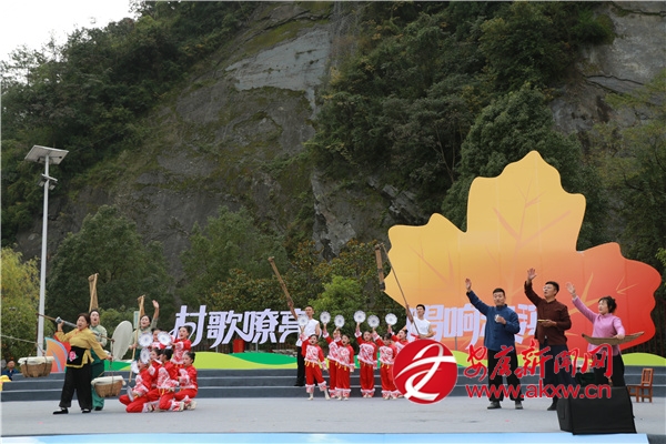 金秋時節(jié)的茨溝鎮(zhèn),萬畝紅葉、層林盡染。伴隨著歡快的鑼鼓聲,茨溝鎮(zhèn)、五里鎮(zhèn)、譚壩鎮(zhèn)三支隊伍輪番登場,不僅獻唱原創(chuàng)村歌,還展示特色產(chǎn)業(yè)、優(yōu)質(zhì)資源與地方文化,紛紛亮出獨具特色的“看家絕活兒”。歌伴舞《村歌飛揚》《松壩謠》《幸福歌兒唱起來》唱出了鄉(xiāng)親們的幸福生活;以修建八一水庫為背景的安康歌謠《我來了》引發(fā)會場共鳴;民俗表演《龍的傳人》則將節(jié)目推向高潮。舞蹈、鄉(xiāng)村T臺秀、民俗表演、八岔戲等節(jié)目,或以傳統(tǒng)幽默詼諧的風(fēng)格,或以深情敘述的方式,展現(xiàn)鄉(xiāng)村新生活,為觀眾獻上一場別開生面的視聽盛宴,現(xiàn)場歡呼聲此起彼伏。
