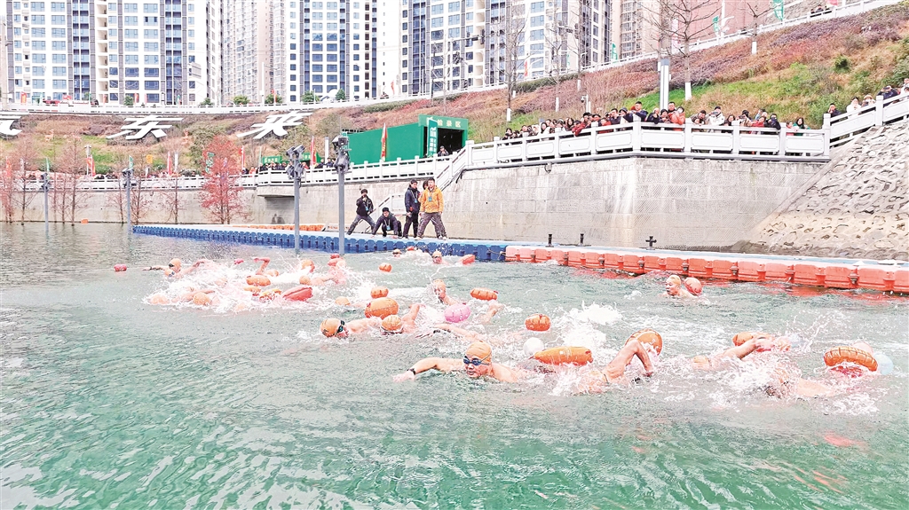 12月21日,陜西省第八屆漢江公開水域冬泳賽在紫陽縣月畔灣廣場水域舉行。當(dāng)天,來自陜西、湖北、四川、重慶、河南、內(nèi)蒙古自治區(qū)的44支代表隊(duì)400余名運(yùn)動員報名參賽。(儲茂銀 攝)
