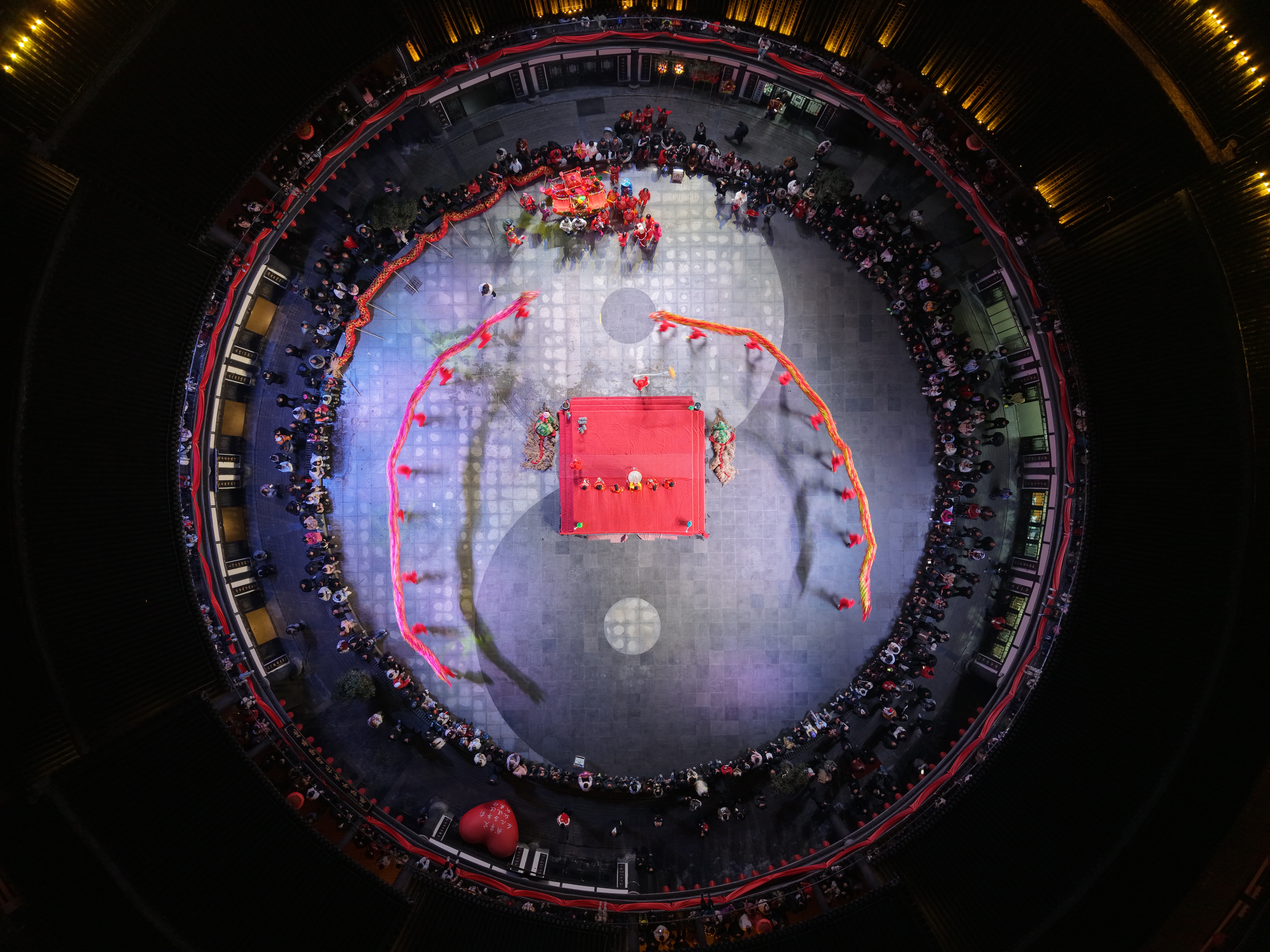 如果說老街的巡游充滿了市井的煙火氣,那么在秦巴風(fēng)情園內(nèi),非遺民俗表演則將這里的氣氛推向了高潮。夜幕降臨,風(fēng)情園廣場上早已人山人海。隨著鏗鏘的鑼鼓聲,巨龍穿梭起舞,龍身翻轉(zhuǎn)騰挪,場面熱烈。