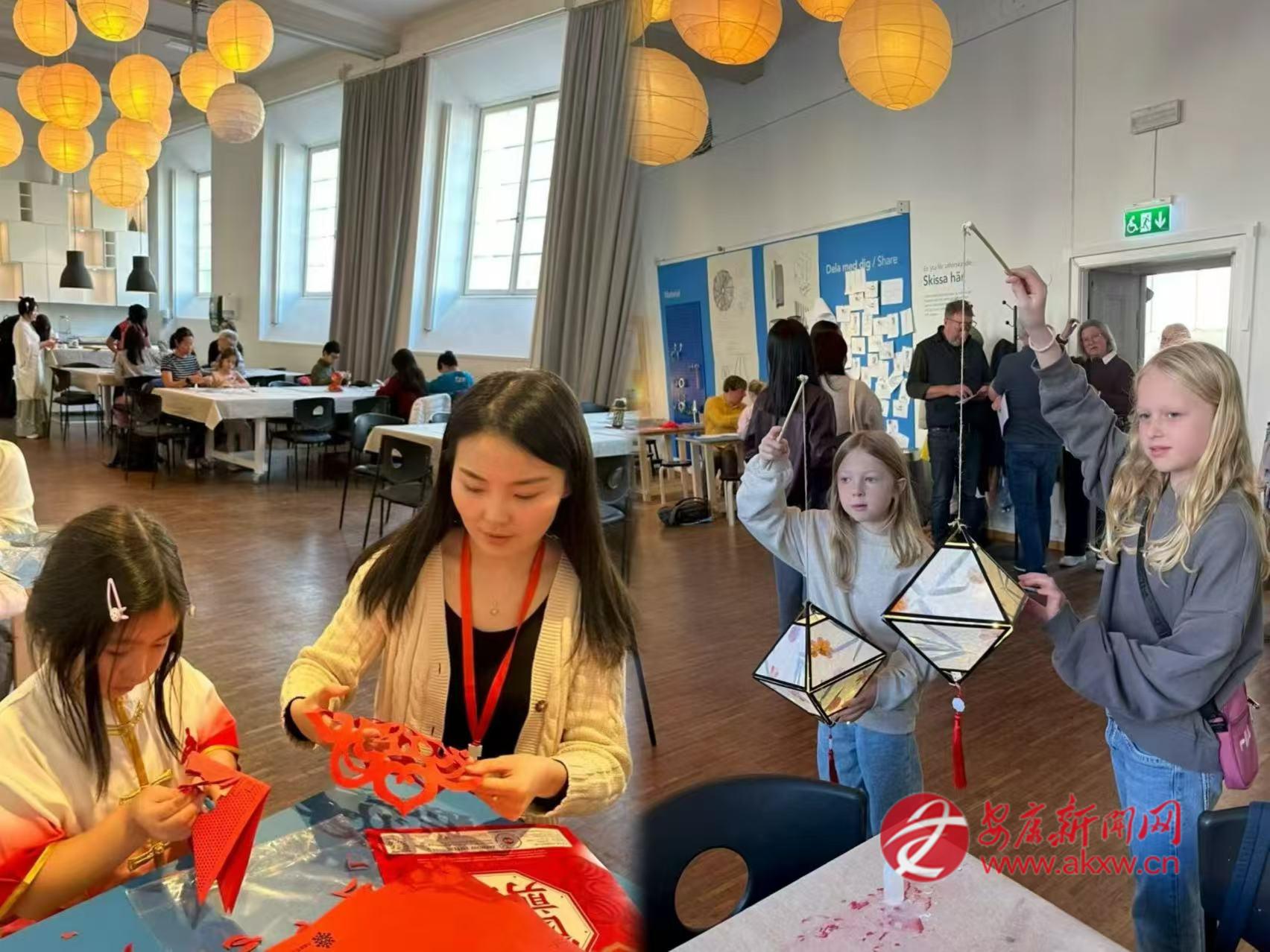 2025年中秋節(jié),邱萌受邀參加哥德堡總領(lǐng)館舉辦的文化活動,在哥德堡市立博物館的展廳里,她教當(dāng)?shù)睾⒆觽冏鰺艋\、剪剪紙。邱萌和孩子們一起用宣紙折疊成燈籠,讓瑞典人得以近距離觸摸中國節(jié)日。有人好奇地問起中秋的月亮,她便講起嫦娥奔月的傳說,講起月餅的寓意,講起“千里共嬋娟”的詩句。博物館里點(diǎn)亮了許多盞燈籠,每一盞都映照著孩子們專注而好奇的臉龐。