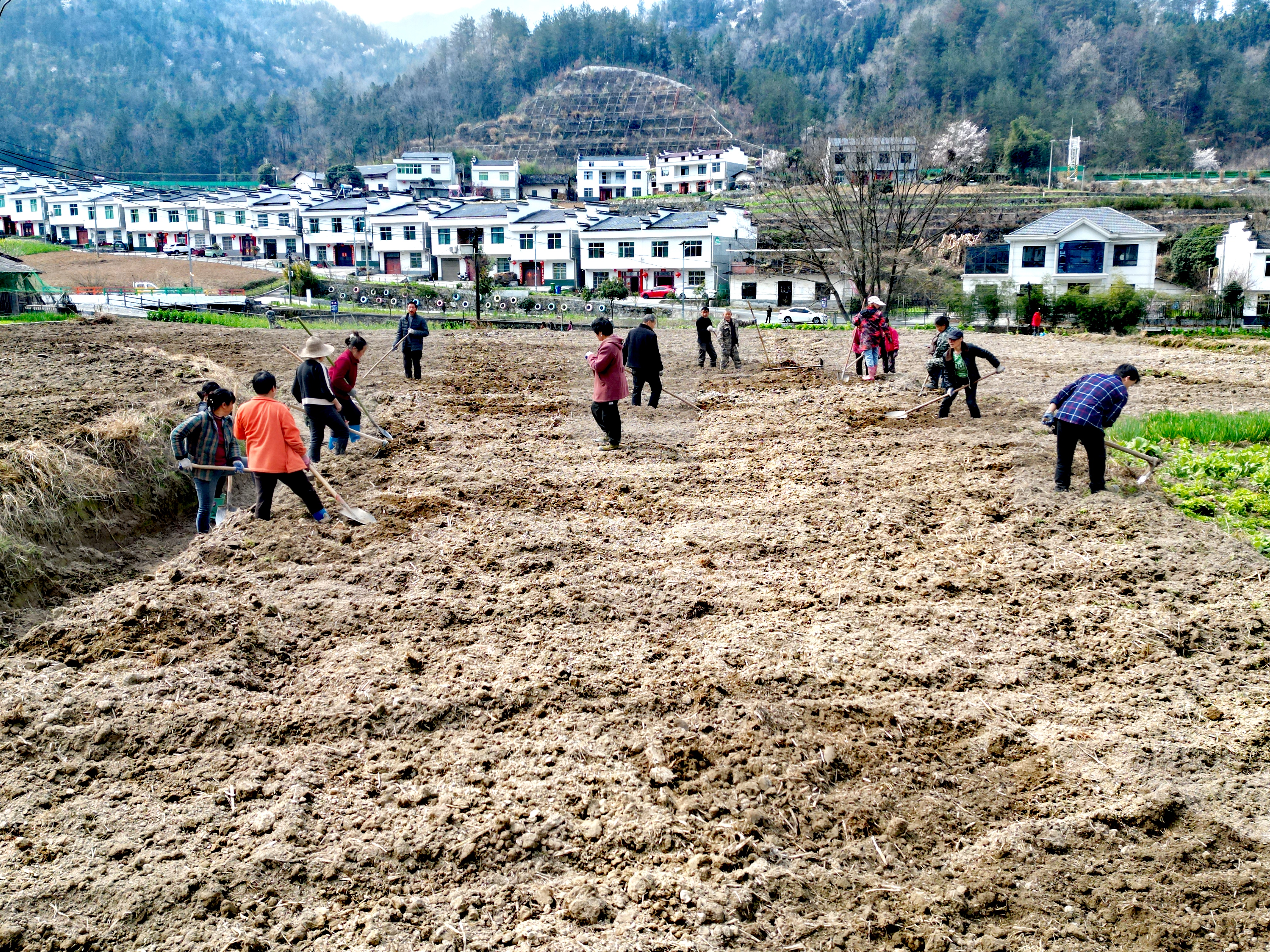 3月5日,走進廣佛鎮(zhèn)八角廟村絞股藍基地擴建現(xiàn)場,拖拉機在田間來回穿梭,有序開展翻耕、碎土、平整作業(yè);村民們緊隨其后,手持農(nóng)具整地、施肥、抽廂、打窩、播種、覆土,田間地頭一派如火如荼的春耕景象。