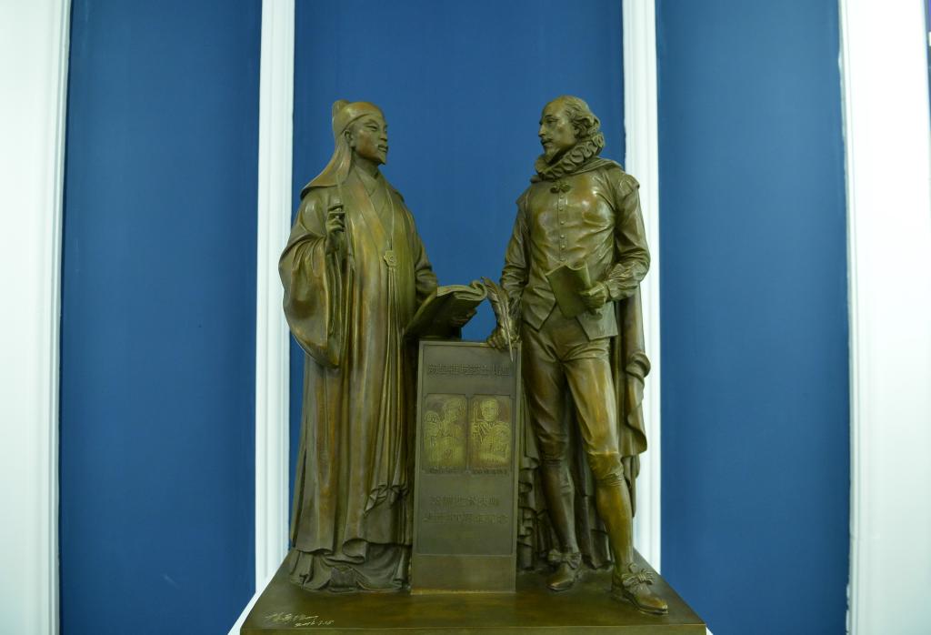 這是中國(guó)江西撫州湯顯祖紀(jì)念館陳列的湯顯祖遇見(jiàn)莎士比亞銅像(2016年10月12日攝)。新華社記者 周密 攝